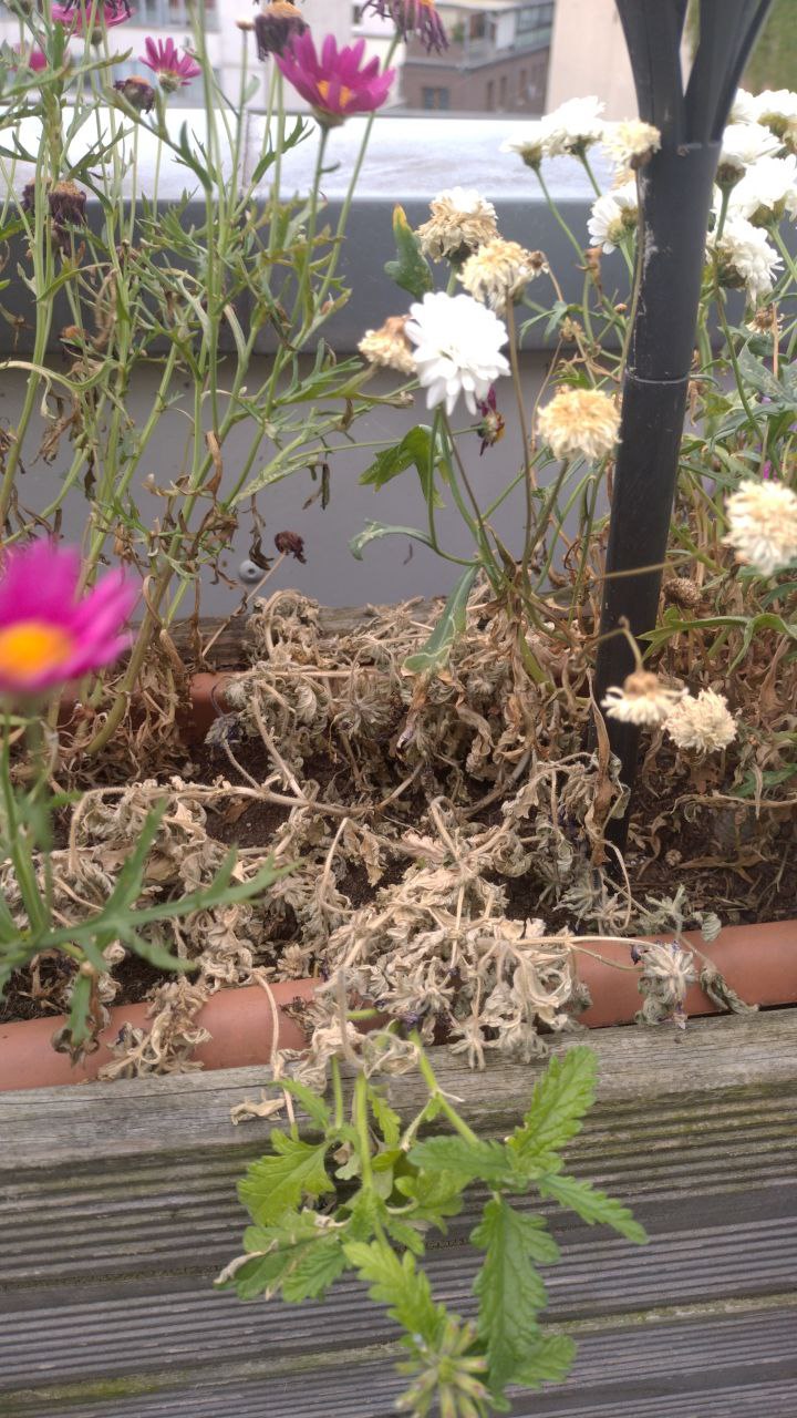 Wenn ich mir das jetzt so betrachte... 🤔 Ein bisschen sieht das Grüne aus, als wollte es sich vor Verzweiflung vom Blumenkasten stürzen. |
