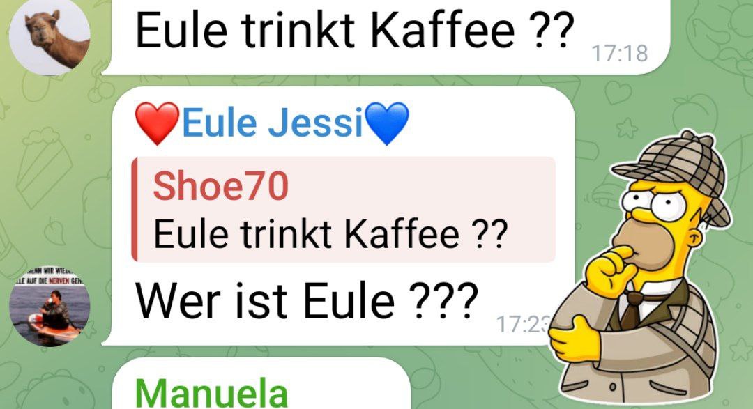 {"message_id":26963,"from":{"id":5651947712,"is_bot":false,"first_name":"❤️Eule","last_name":"Jessi💙","username":"ProudMommyOfTwo"},"date":1702398194,"chat":{"id":-623529108,"type":"group","title":"Krefeld klandestin","all_members_are_administrators":false},"reply_to_message":{"message_id":26962,"from":{"id":5767104875,"is_bot":false,"first_name":"Shoe70","username":"moinsen_70"},"date":1702397928,"chat":{"id":-623529108,"type":"group","title":"Krefeld klandestin","all_members_are_administrators":false},"text":"Eule trinkt Kaffee ??"},"text":"Wer ist Eule ???"} |
