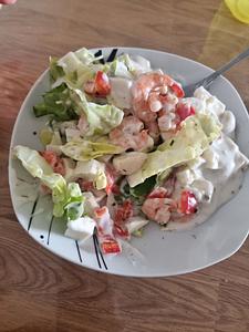 Einfach Salat dazu rote Paprika, Party Garnelen, Mozarella, eingelegten Knoblauch davon stinkt man nicht so..und Salatsoße that's it very simple 😂😜 |