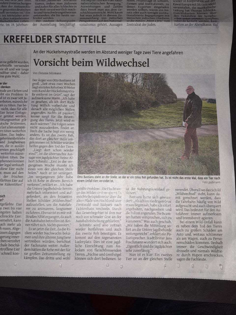 Apropos Rolf: er hatte mir einen Zeitungsbericht über Wildwechsel an der Hückelsmaystraße geschickt. Sollen wir dazu auch was schreiben? |