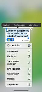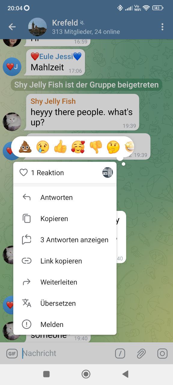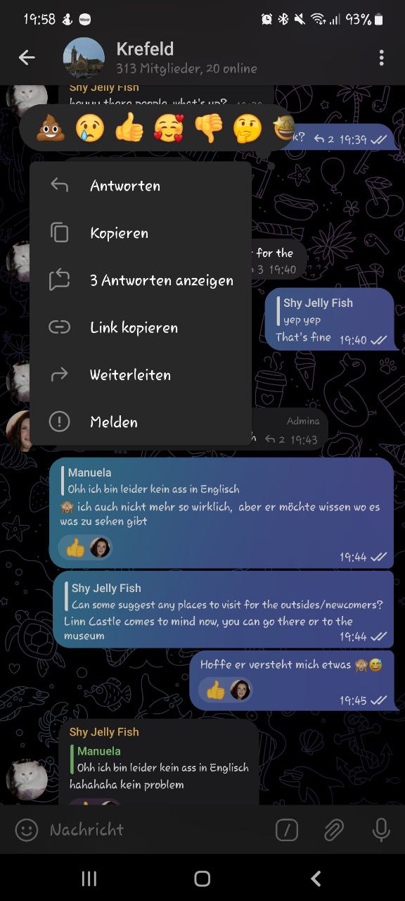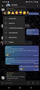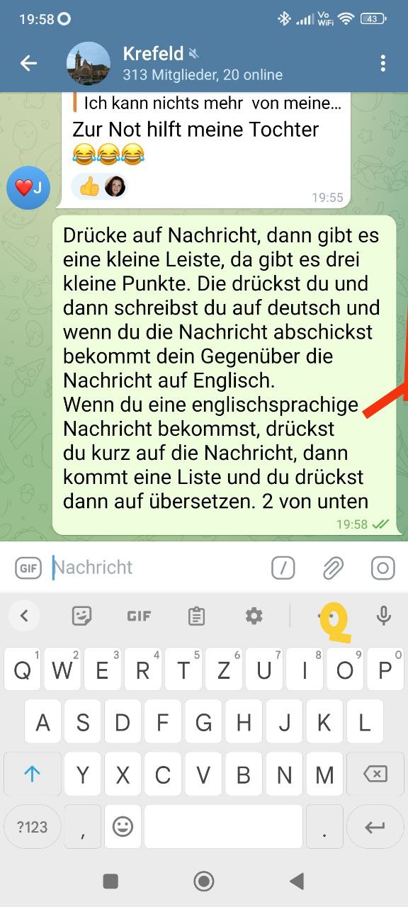 {"message_id":68317,"from":{"id":1247249585,"is_bot":false,"first_name":"Gabi"},"date":1677437887,"chat":{"id":-1001377166351,"type":"supergroup","title":"Krefeld"},"text":"Drücke auf Nachricht, dann gibt es eine kleine Leiste, da gibt es drei kleine Punkte. Die drückst du und dann schreibst du auf deutsch und wenn du die Nachricht abschickst bekommt dein Gegenüber die Nachricht auf Englisch. \nWenn du eine englischsprachige Nachricht bekommst, drückst du kurz auf die Nachricht, dann kommt eine Liste und du drückst dann auf übersetzen. 2 von unten"} |