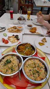 Biryani in verschiedenen Variationen. Das ist ein besonderes angebraten Reis mit Huhn oder Lamm oder so. Und dazu haben wir die halbe Karte an kleinen Snackgerichten bestellt. Das war genial. |
