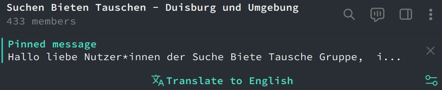 {"message_id":119984,"from":{"id":10360828,"is_bot":false,"first_name":"Thomas","last_name":"Bayen","username":"tbayen","language_code":"de"},"date":1755338782,"chat":{"id":-1001377166351,"type":"supergroup","title":"Krefeld","username":"krefeldgruppe"},"reply_to_message":{"message_id":119979,"from":{"id":5846665296,"is_bot":false,"first_name":"MC"},"date":1755335455,"chat":{"id":-1001377166351,"type":"supergroup","title":"Krefeld","username":"krefeldgruppe"},"text":"Hallo hallo, ich bin letzte Woche von Hamburg nach Krefeld gezogen und frage mich ob es hier auch so Tausch Gruppen und verschenke Gruppen gibt. Freue mich ΓΌber jede info :)"},"text":"Hallo und Willkommen in unserer Gruppe! π"} |